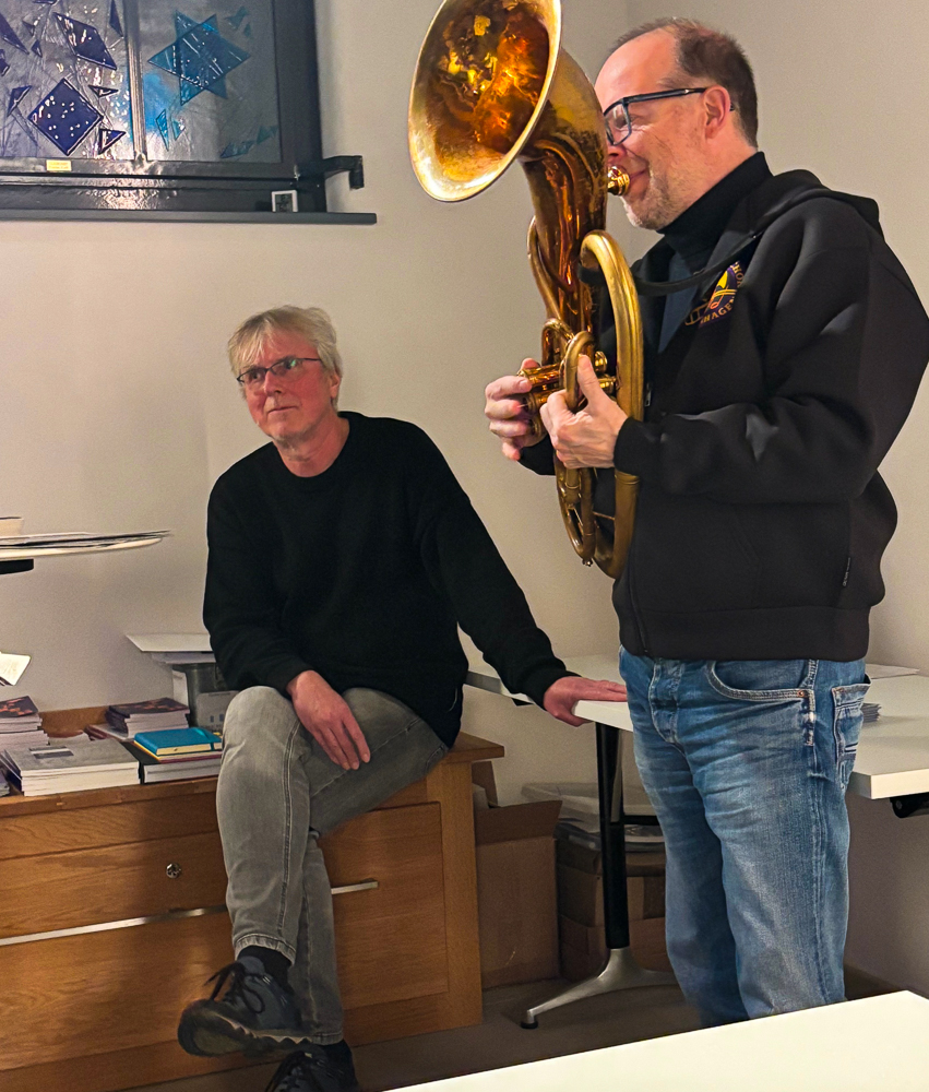 Allerdings kam der Posaunenchor mit allen Instrumenten und unser Vorsitzender wurde immer wieder durch musikalische Beiträge des Posaunenchores unterbrochen. Spannende Frage: War bisher schon jemals ein Poaunenchor in der Synagoge zu Gast?? Wahrscheinlich nicht - es ist zumindest nichts in der Art überliefert. So aber bliesen die Trompeten und Posaunen zu Ehren der Mitglieder der jüdischen Gemeinde - ein Konzert leider ohne weitere Zuhörer.